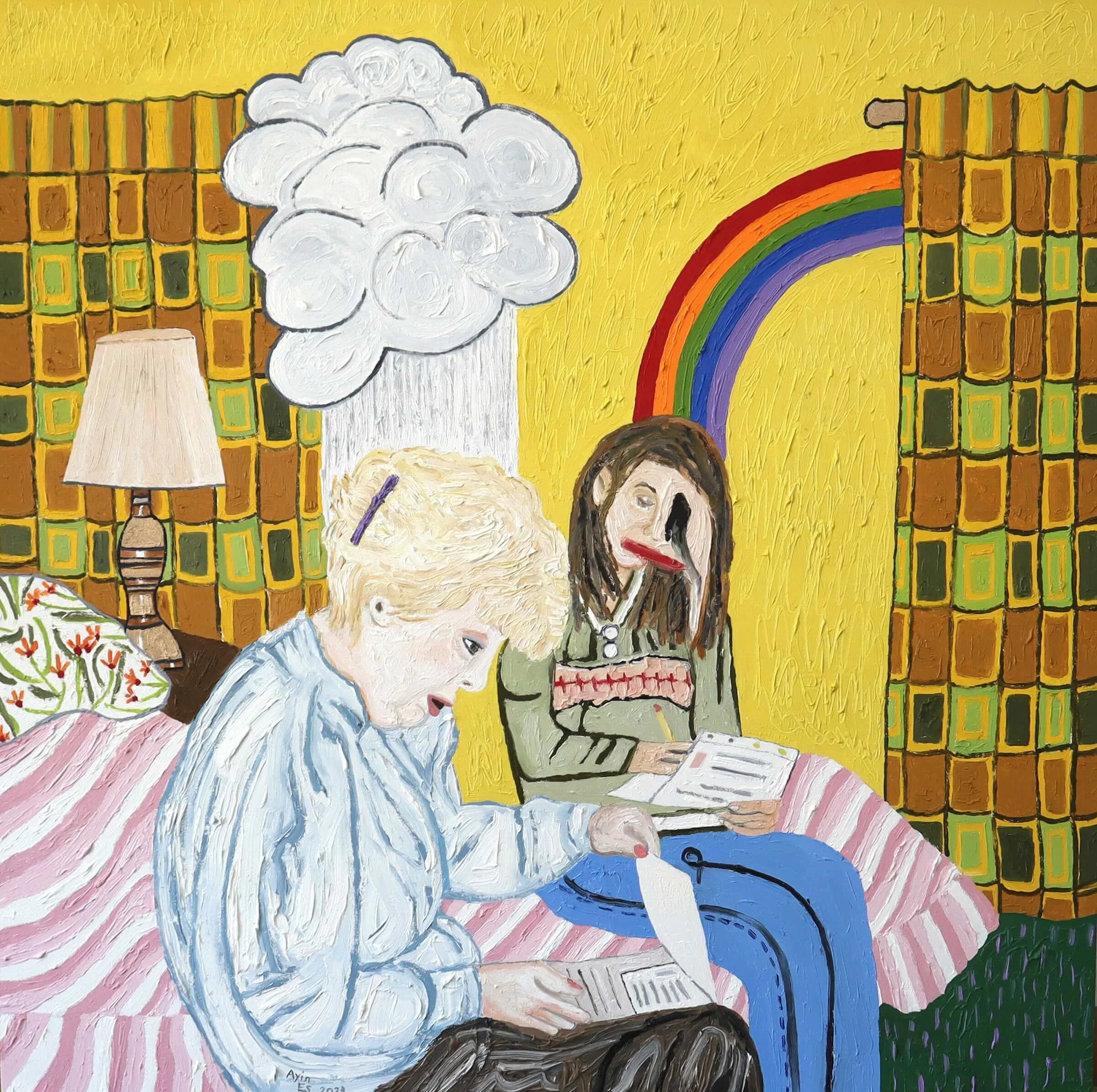Autobiographical storytelling—often unsettling and raw—is at the core of Ayin’s practice. Rooted in survival, they maneuver between the precipice of memory and identity by disclosing their internal, lived experience while highlighting family estrangement, trauma, disability, and gender politics. Their latest series of paintings originated from an old suitcase of vintage family photos. With playful, satirical tones and thick, textural oil paint, Es recasts these overlooked snapshots and replace their younger self with aspects of their present self. Incorporating their gender-affirming surgery scars with smeared faces, dark rainclouds, and decorative hues of the 1960s and 1970s, these paintings disrupt the family hierarchies that rendered them invisible.