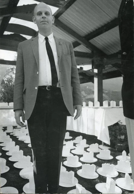Claes Oldenburg at Jim Elloit's Wedding, with his plaster cake slices, 1966
