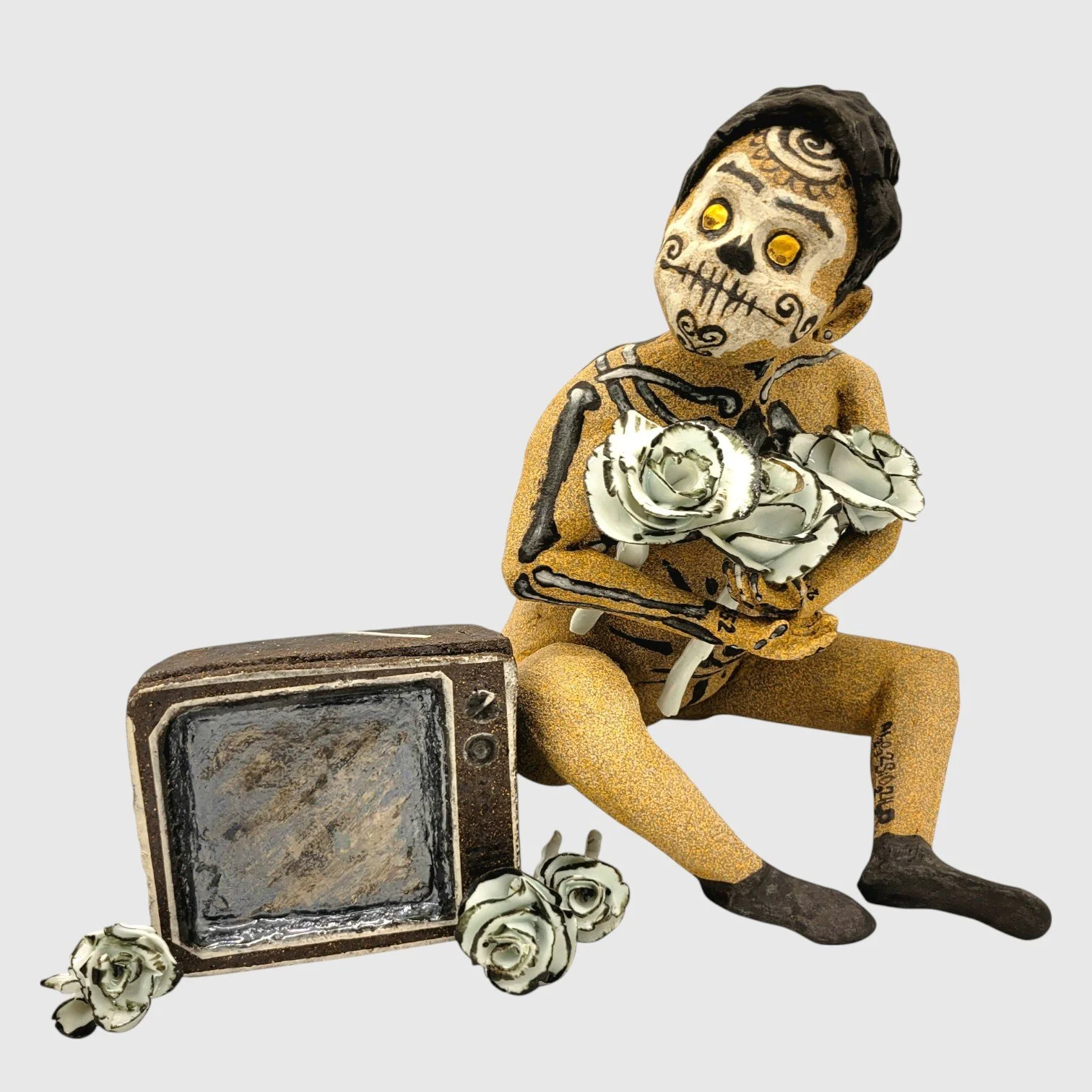 A consummate maker and first generation Mexican-American, Jiménez Jr. creates dynamic ceramic installations that function as open-ended self-portraits exploring individual identity and systems of belonging. Each collection of objects plays with rituals and personal belief systems: the mind, body and spirit triad manifest as sculptures of literal organs, while the Christian trinity of father, son, and holy spirit appear as a male figure, a crab, and a skull. Iconography from the artist’s ancestral Mexico, like these flowers and skulls, are stylized in the fashion of his beloved comic books. Jiménez Jr.’s figures and objects are not necessarily locked into their arrangements—they can be recombined and transformed. All together, these modular portraits are ofrendas, fluid altars to selves past, present, and future.