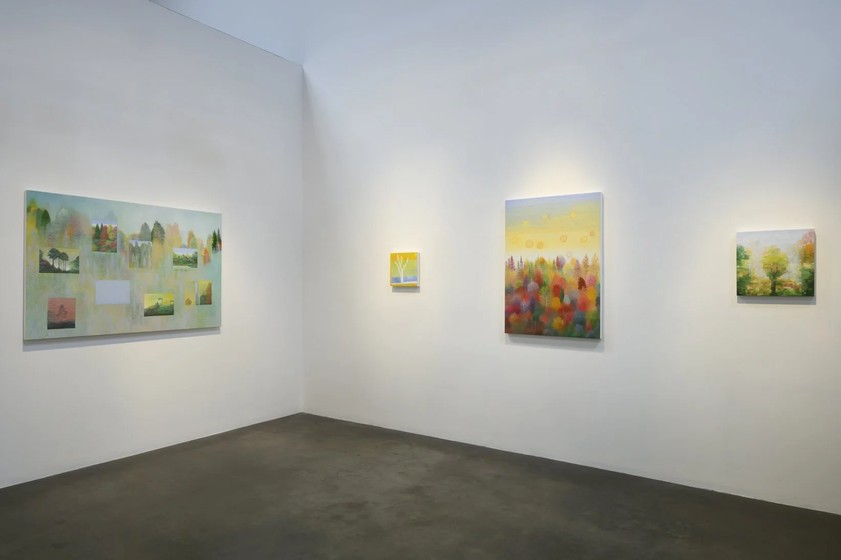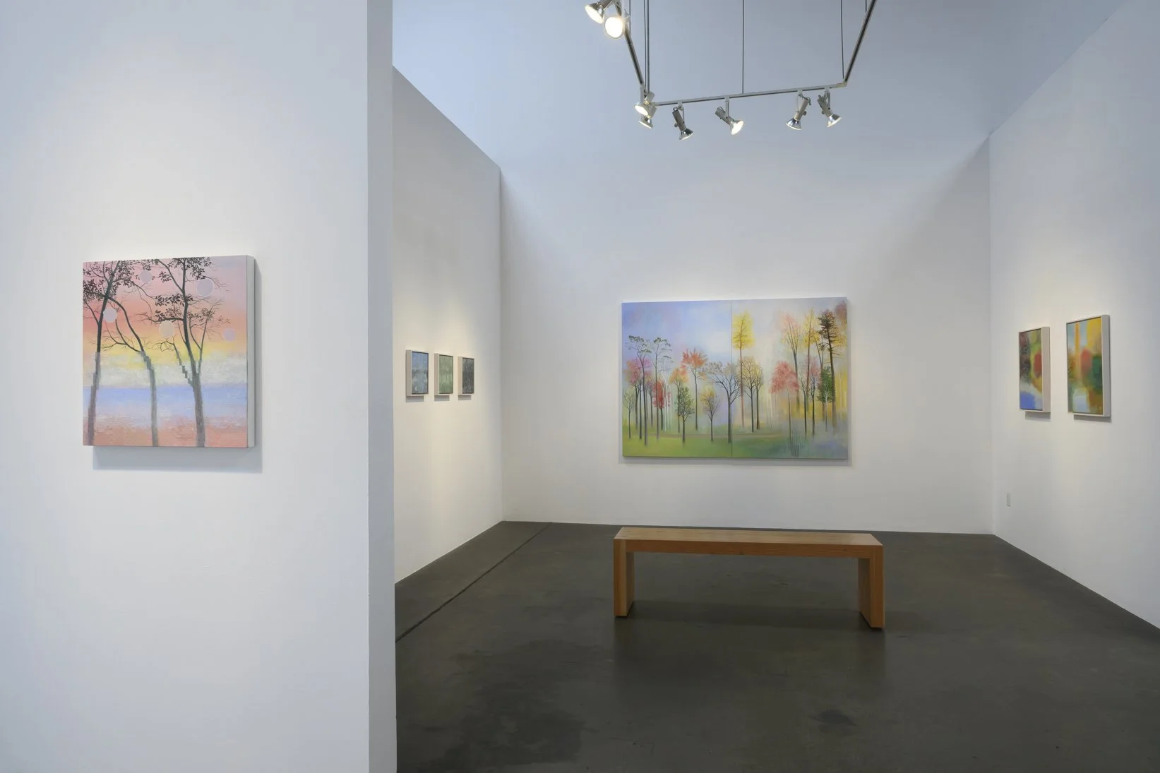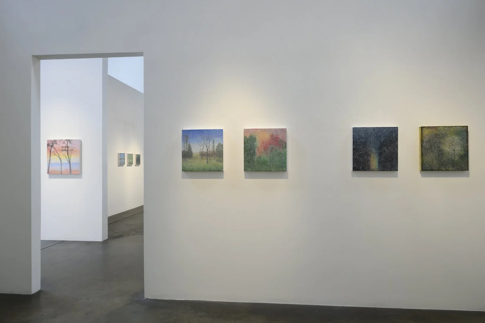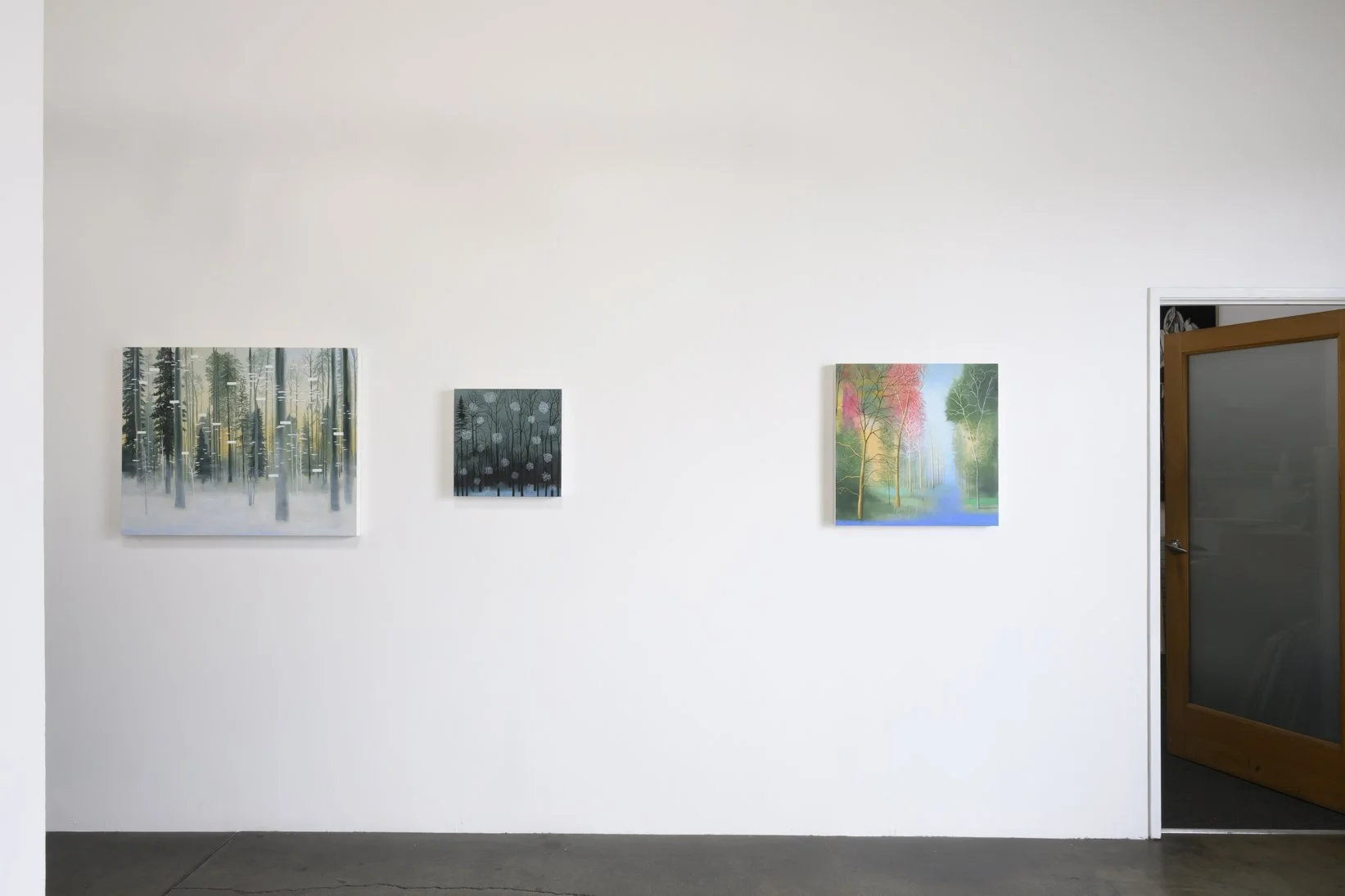 Having worked with Astrid Preston in the 1980s at Jan Turner Gallery, and then at Craig Krull Gallery since 1999, we have been on a meandering path together through her metaphysical and ever-evolving landscapes, or more appropriately, her deconstructed interpretations of natural phenomenon. Over the years, I have consistently pointed out that landscapes do not exist in nature, they are purely a mental construct. And, in support of that perspective, Astrid recently wrote, “Quite early I found that working directly from nature was too distracting.” Her “landscapes” have always embodied mystery because she is suggesting that something is either about to happen, something is missing, there are unexpected occlusions, perception is veiled, or ultimately, “ceci n’est pas un paysage.” In this regard, her new exhibition For the Trees, (i.e. “can’t see the forest for the trees”) is appropriately titled. These paintings continue her ironically crystal-clear obfuscation with untethered floating geo-orb snowflakes, or rectangular snowflakes seen from a moving car that look like questionnaire boxes that need to be filled in. Fractal webbing is scrimmed over the entire surface of some paintings, implying the natural geometry that unites us all. She renders fog as one might expect, in a blur of ambient tones, but it’s not really fog, just look at the next painting and it becomes a three-part grey scale à la Brice Marden. Occasional glowing blips of protoplanets pulse here and there, reminding us that she also supports astronomy research at UCLA, another vast unknown.