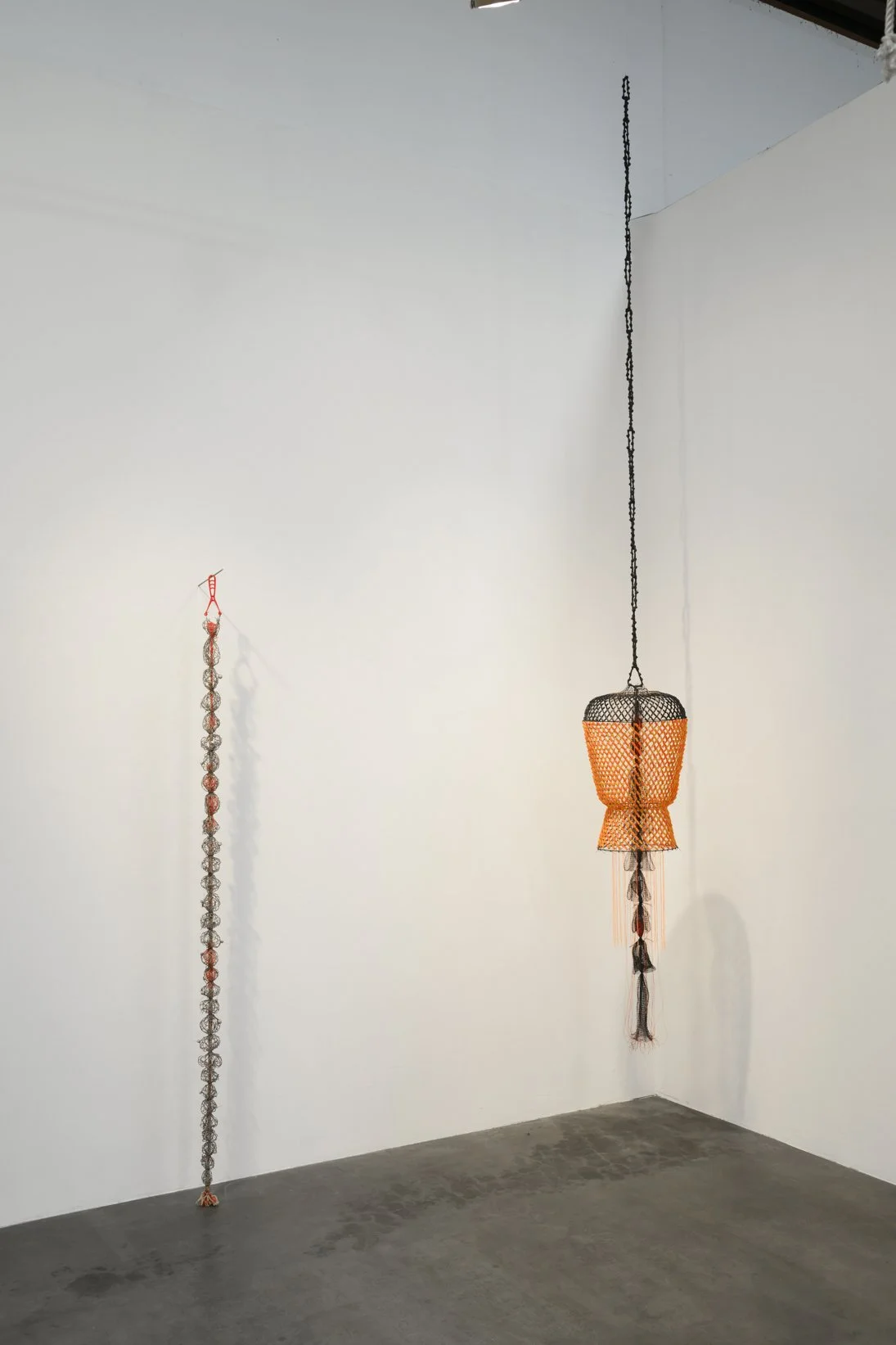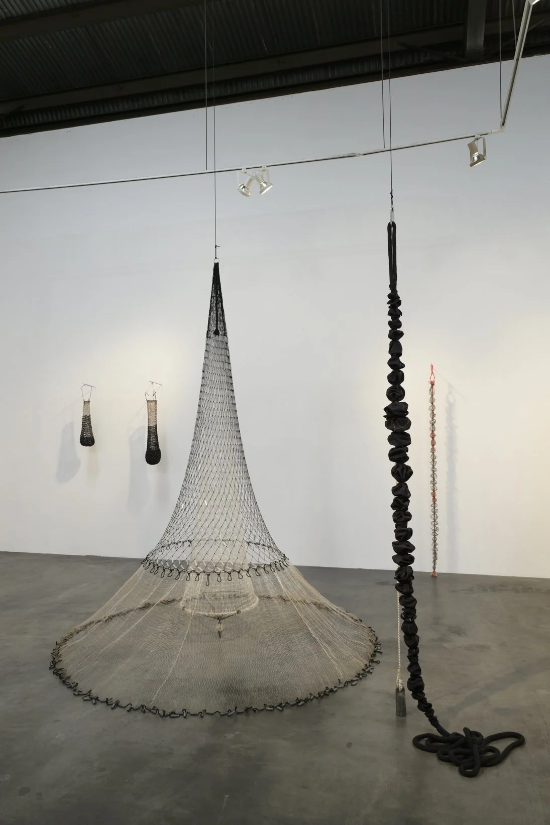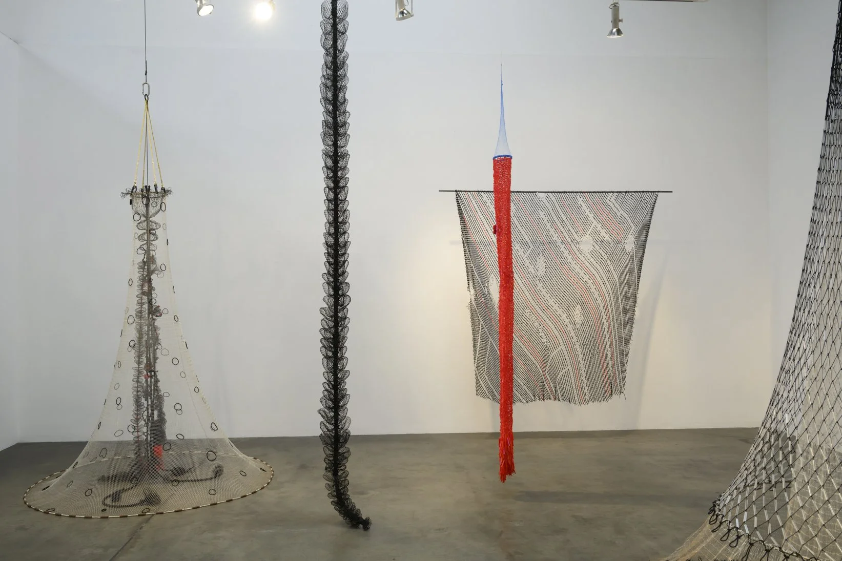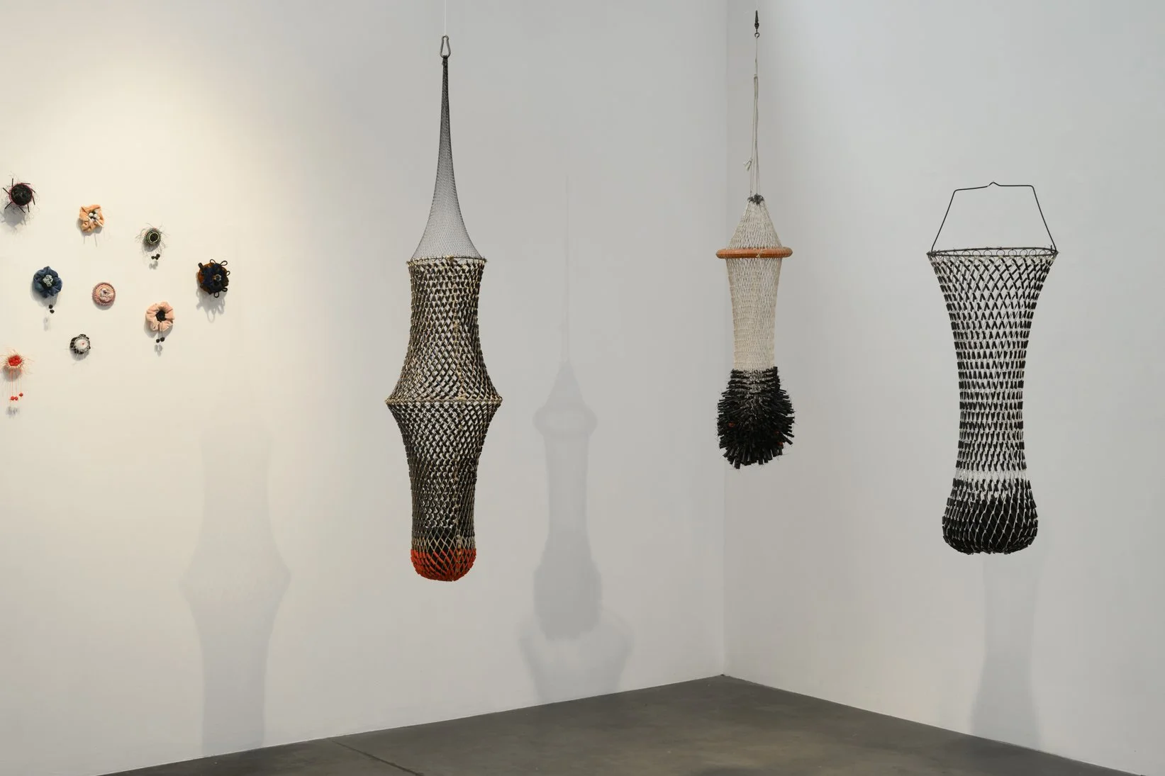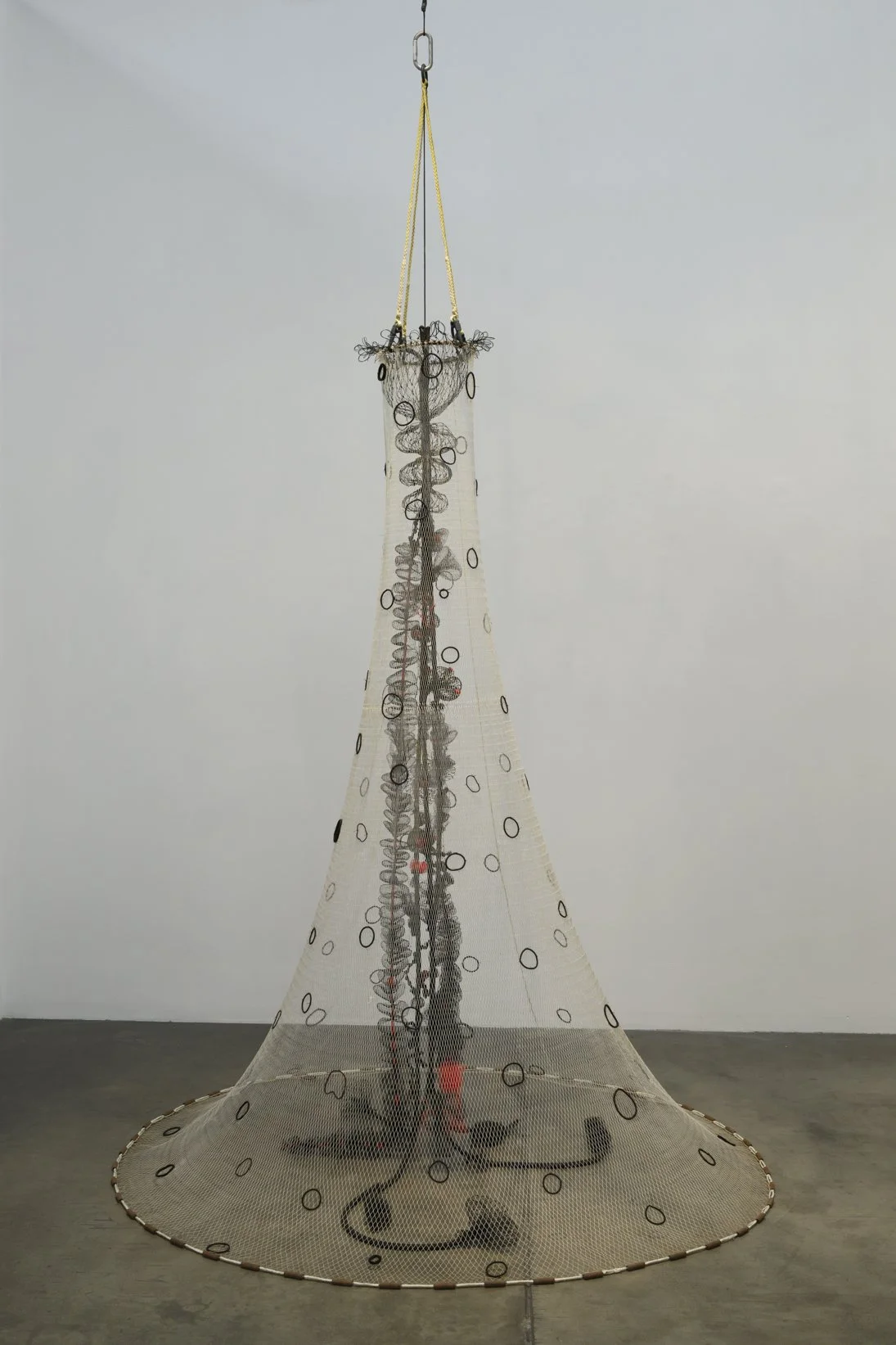Blue McRight’s daily practice of picking up and collecting plastic pollution is the foundational action from which she has created the works in her new exhibition, Gather. As a long-time scuba diver, she has witnessed the organic processes of the underwater world, life and death, gender fluidity, reproduction and communication. Her sculpture is made of salvaged plastic straws, rope and hairbands, but also former instruments of death such as fishing nets, fish and crab traps and bait baskets. She assembles these materials into flowing, intertwined conglomerates that, when suspended from the ceiling, give the impression of floating within a tall kelp forest. Other forms resemble colorful, spikey, sea anemones attached to the wall. She states, “while diving, I am always fascinated by wildly encrusted mooring blocks, ropes, and a huge array of other surfaces whose takeover by intricate colonies of sea life is underway.” Shakespeare describes the process as “a sea change into something rich and strange.” The netting she employs, in some cases actual fishing net, and in others plastic mesh wrapping from Christmas trees or small cheese wheels, recalls the clear bodies of many marine species whose interiors are visible. Her re-imagining and repurposing of these materials “asks us to confront the possibilities of what we thoughtlessly discard, giving agency to the rejected as it assumes space in the realm of the cultural dialogue.”