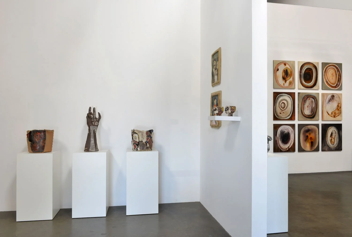 The installation will include large scale sculpture by Ray Barsante, coil built vessels by Brittany Mojo, Edo Antal and Pascale Vaquette, miniature, classically shaped vessels by Ariane Shahbazi, as well as personal narrative work by Elizabeth Scott, Jorge A. Jiménez Jr. and Lucas Pincer-Flynn. Claudia V. Solórzano references architectural elements of East LA, while Dora De Larios and Victor Reyes draw from ancient and contemporary Mexican culture, and Pearl Jusem reimagines ancient animal-shaped askos. Louise Martens’ playful figures in yoga poses recall Mayan and Aztec Chac Mool, while Pez Cocinado advocates for plastic free oceans in her colorfully inventive fish dishes and pots. The work of Kevin Kowalski, Chris Miller and Bianca Juarez take the alchemical, experimental aspects of glazing and firing to new levels of discovery. Stan Edmondson and Ned Roche deconstruct and reconstruct bull skulls and giraffes with tiny heads. Amy Kivnick, Gina Zycher, Kristi Sherman and Stacy Fong, all members of the ceramic workshop, Still Life Studio add modernist and historical touches to the ever evolving and deep history of vessel making. Also, on view for the first time in the US, are works by Costa Rican artist Daniela Martén Rothe, whose acrylic paintings of earth toned, egg-shaped abstractions are made with pumice stone, charcoal, sand and clay native to her country. Her gestural ovoids recall the stains and swirls of wet clay that result from the focused centering of material on the spinning potter’s wheel.